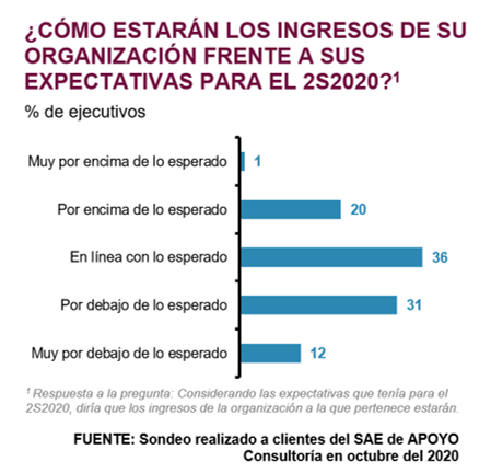 La marcha de los ingresos de las empresas clientes SAE durante el 2S2020 evidenciaría lo difícil que está resultando predecir la evolución de la demanda durante los primeros meses posteriores al arranque de las fases de reactivación económica. En este sentido, solo el 36% de los ejecutivos señaló que el desempeño de las ventas de sus negocios en el 2S2020 se sitúa en línea con sus expectativas.